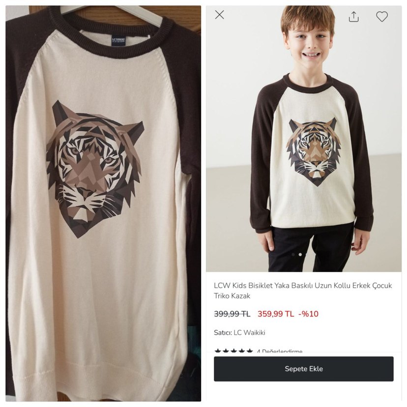 LCW Kids marka, bisiklet yaka, uzun kollu, bol kesim, kürk detaylı, kahverengi ve gri tonlarında baskılı erkek çocuk triko kazak.