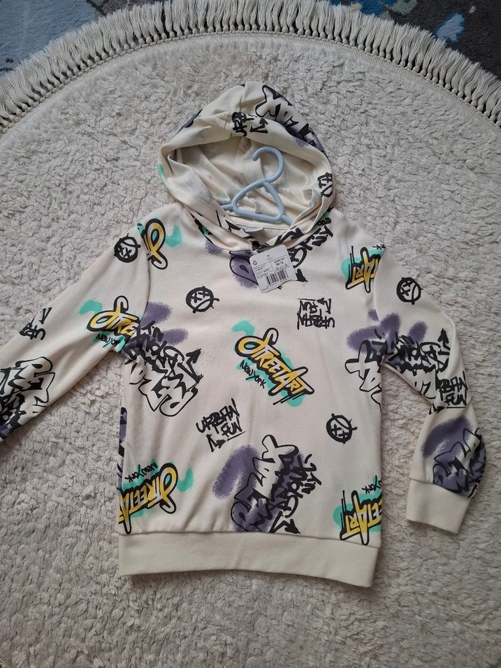 yeni ürün sadece mağazada kolunda leke varmış fark etmedim etiketi üzerinde fazlalıktan dolayı satıyorum 7 yaş uyumlu LCW Kids'in beyaz, bol kesim erkek çocuk sweatshirtü kapüşonlu ve uzun kolludur. Yumuşak sentetik kumaştan örme dokuda, renkli sokak stili baskılarla süslenmiştir.