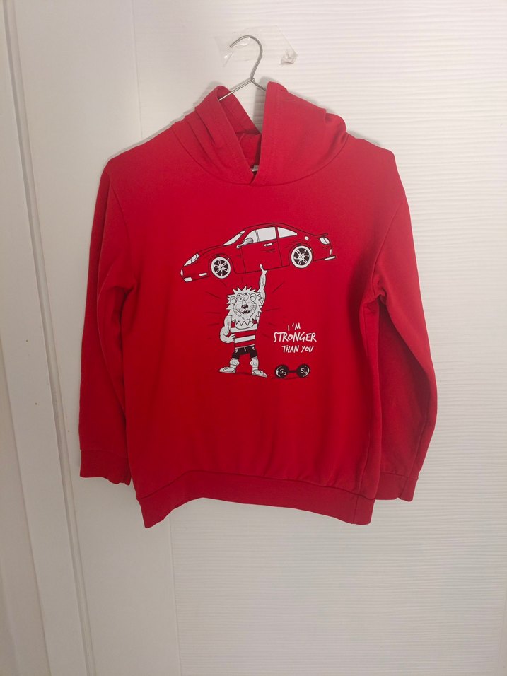 Kırmızı kapüşonlu, uzun kollu ve bol kesim erkek çocuk sweatshirtü. Yumuşak örme kumaştan ve renkli baskılı desene sahip, rahat sokak stili için uygun. Yeni defosuz safece 1 kez giyildi. Şık baskı içi polar