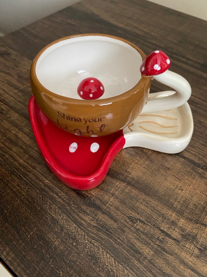 Kırmızı mantar detaylı, 'Shine your light' yazılı renkli seramik fincan ve tabağı. Ürün sıfır kullanılmadı y