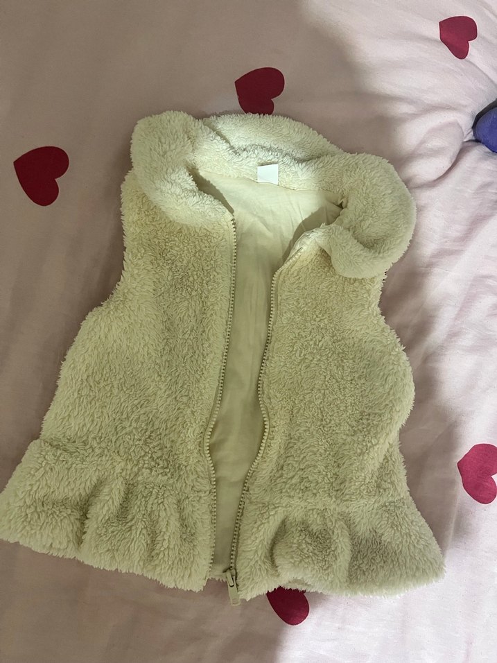 Yüksek yakalı, beyaz renkli, kürk detaylı kız çocuk yeleği. Sıcak ve yumuşak dokulu, sokak stiline uygun kesimde.4-5. Yaş