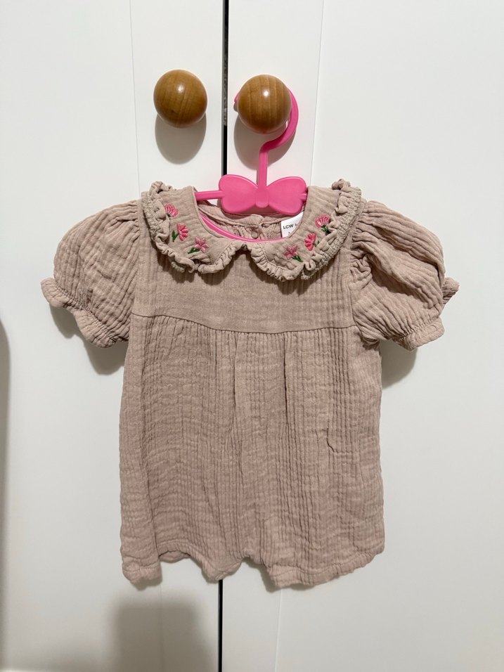 Bej keten kumaştan, nakışlı fırfırlı yakası ve kısa şişme kolları olan bol kesim kız çocuk elbisesi. Bohem tarz.
