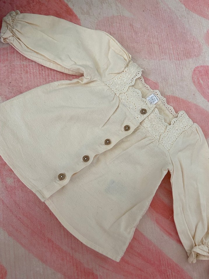 Kız çocukları için pamuklu, bej renk, bol kesim gömlek. Uzun kollu, düğmeli, nakışlı dantel yak temiz yeni bikaç kez kullanıldı