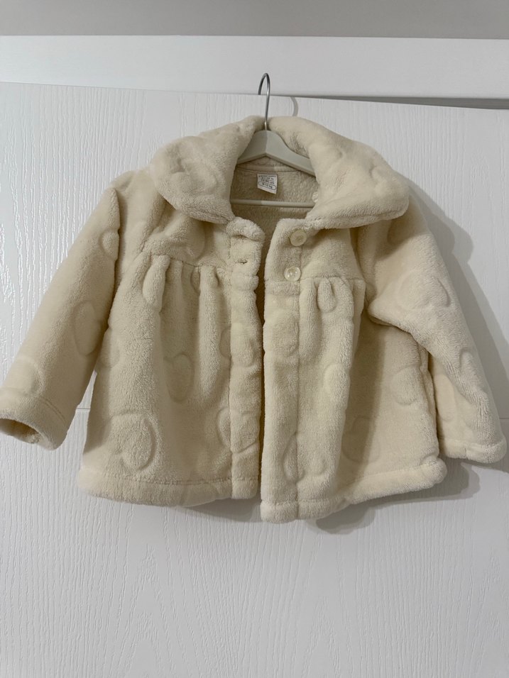 Beyaz renkte, peluş dokulu, kürk detaylı, kesimli yakalı, bol kesim kız çocuk ceketi. Beden uymadığı için 2 defa tek giydi fiyatı uygundur indirim istemeyin