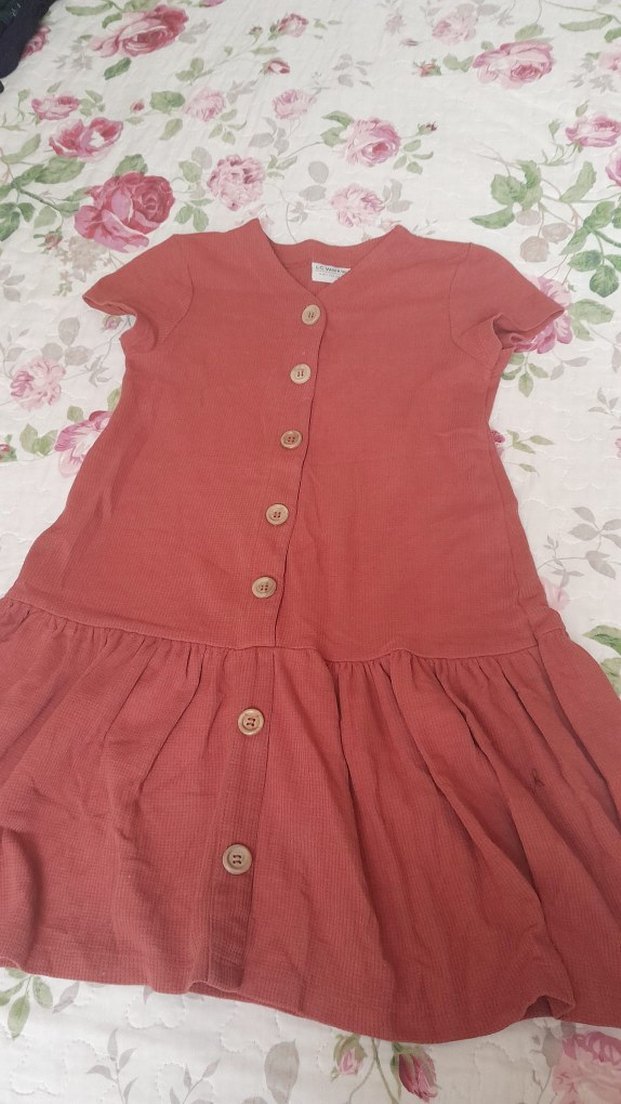 Kısa kollu ve V yakalı, düğmeli, bol kesim kız çocuk elbisesi. Etek kısmı pileli. Lcw marka. 9/10 yaş. Çok rahat bir elbise. Defosu yok.