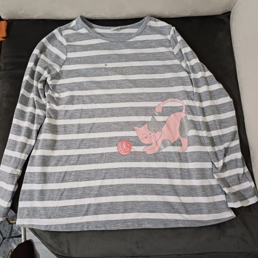 LCW. Gri beyaz çizgili, pamuklu, uzun kollu ve bol kesim kız çocuk tişörtü. Pembe kedi baskısı ve düğme detayları vardır.
