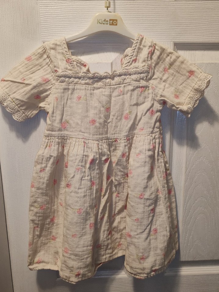 Pembe desenli kız çocuk elbisesi. Sırttan düğmeli, lekesi deformasyonu yok, ütüye ihtiyacı var.