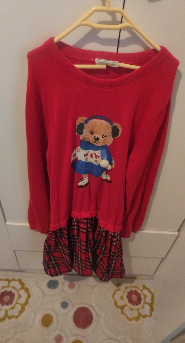 Kız çocuk kırmızı triko elbise, bol kesim, uzun kollu ve yuvarlak yakalıdır. Renkli baskılı ayı figürü ve ekose detaylarıyla sokak tarzını yansıtır. sayılı giyildi tertemizdir