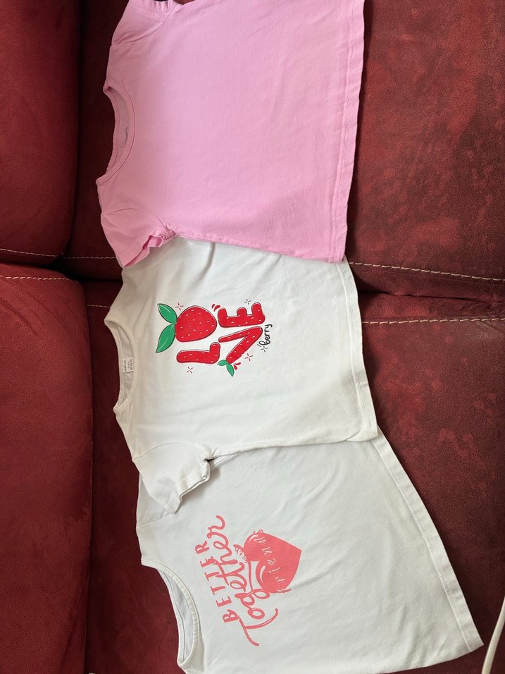 3 tişörtün de bedeni 3-4 yaş. Beyaz kalpli olanın fotoğraftaki gibi baskısında hafif açılma var ama soyulma yok. Diğer 2 tişörtte herhangi bir deforme yok