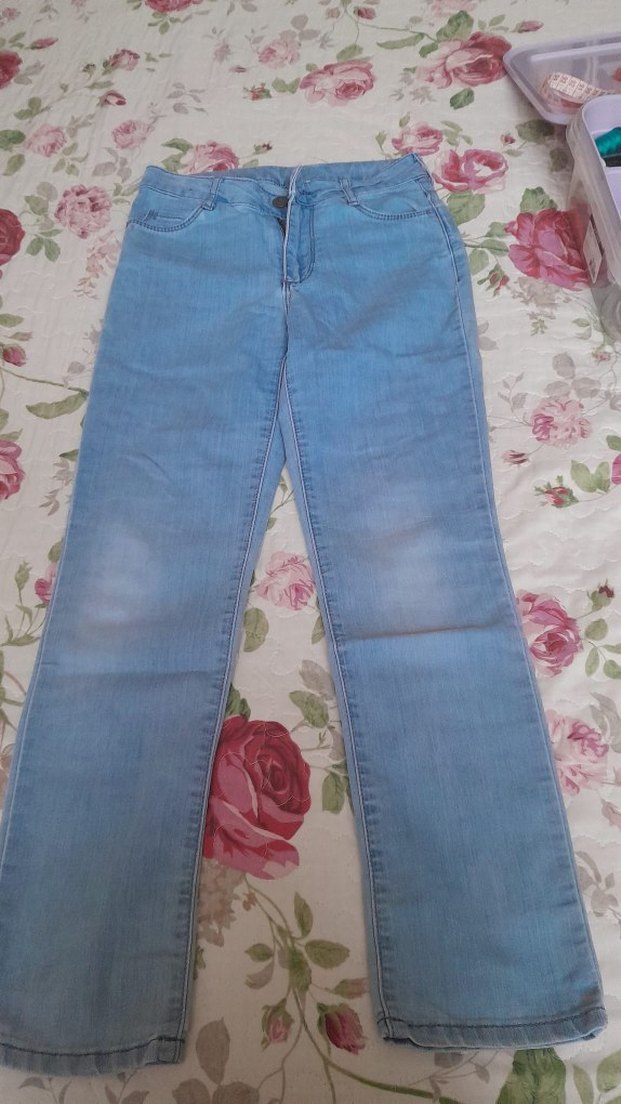 9/ 10 Yaş Mavi denim kumaştan, düğmeli ve beli lastikli ayarlanabilir jean. Mevsimlik. Çok az kullanıldı. Sıfır ayarında. Boyu 85cm.