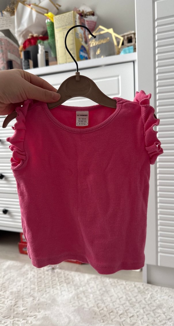 Pembe pastel renkte, kısa kollu ve fırfırlı detaylı, ince kesim kız çocuk tişörtü. Yumuşak keten kumaştan üretilmiştir.