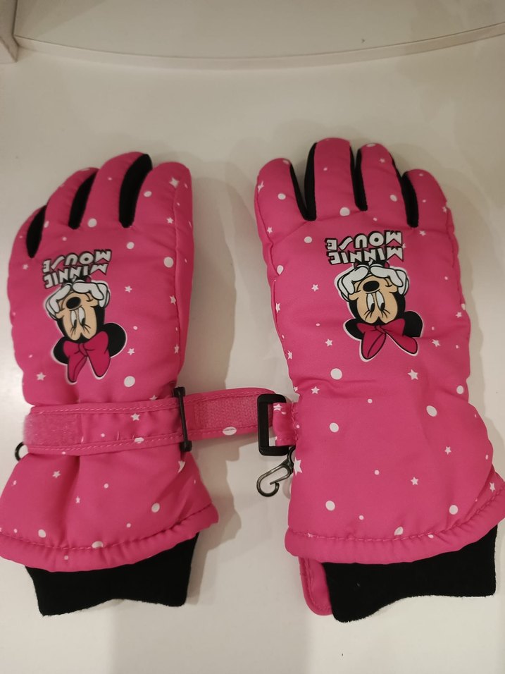 Kız çocuklar için pembe, Minnie Mouse baskılı yumuşak dokulu eldivenler. Ayarlanabilir Velcro kayışları ile rahat kullanım sağlar. 3-5 yaş içindir.
