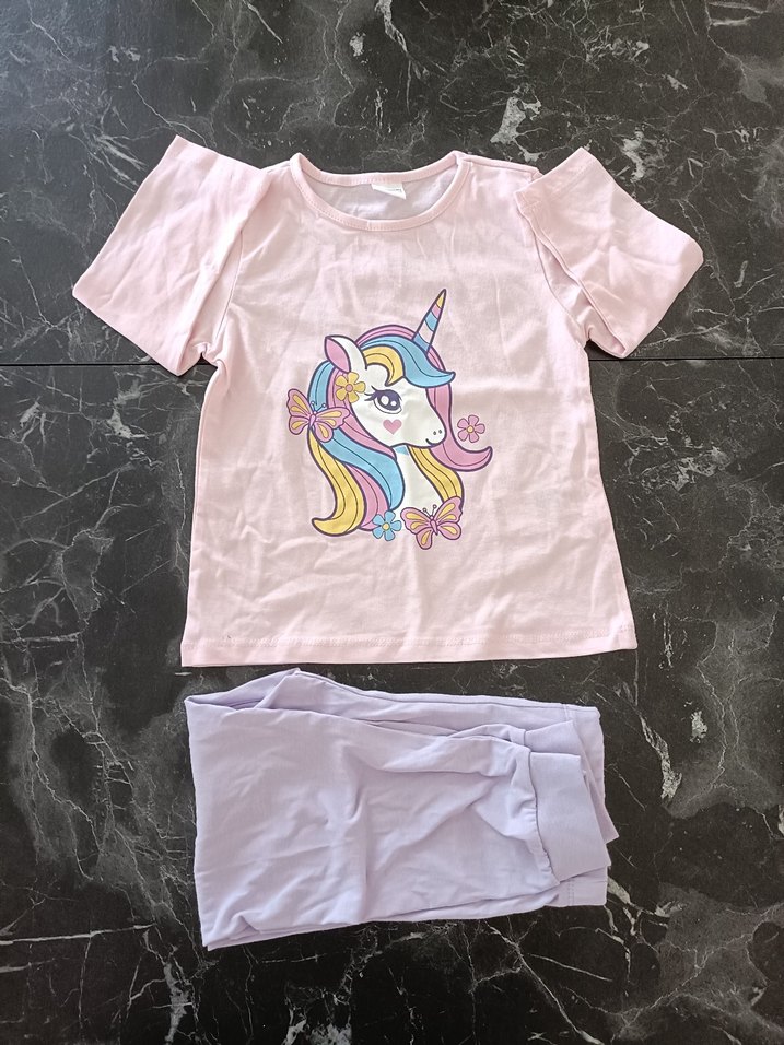 Pamuklu, kısa kollu pembe pijama üstü, renkli unicorn baskılı ve açık mor rahat pijama altından oluşur. Yumuşak ve konforlu uyku için uygun.