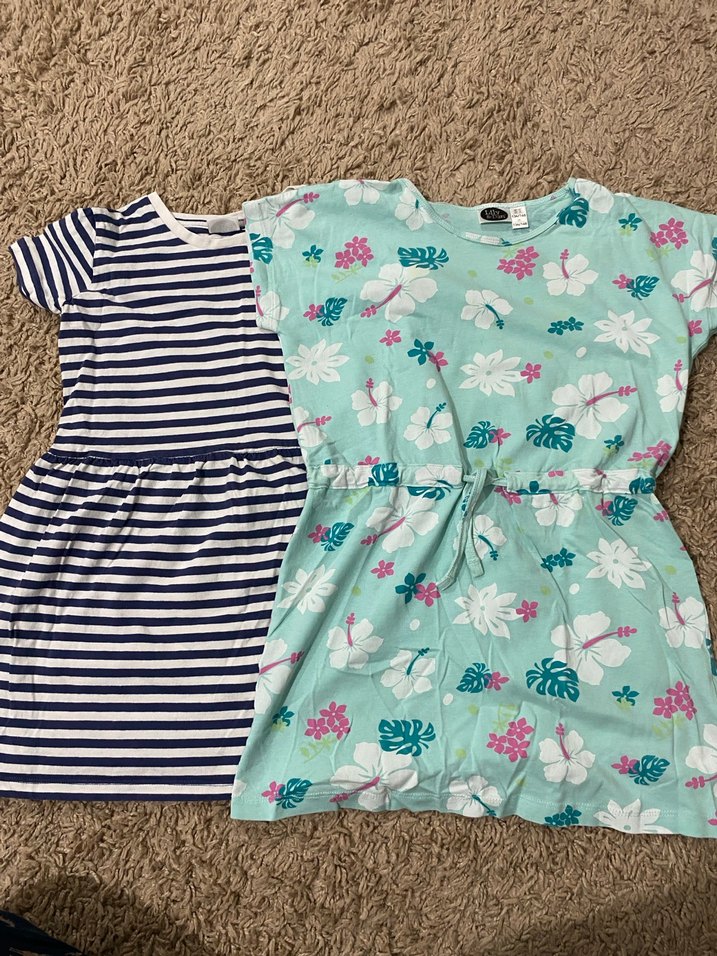 Rahat kesim kız çocuk elbiseleri kısa kollu. Biri renkli batik desenli ve pileli, diğeri çizgili. İkisi de pamuklu ve konforlu.