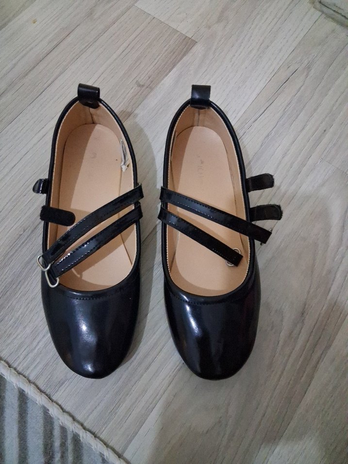 Kız çocukları için siyah, tokalı bantlı, lastik malzemeden yapılmış gotik tarzda babet ayakkabı. bir kaç defa kullanıldı