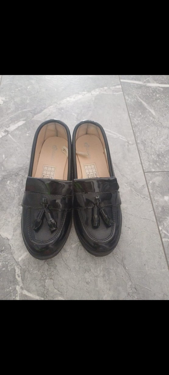 Siyah, püsküllü kız loaferları, kauçuk malzemeden klasik gotik tarzda.