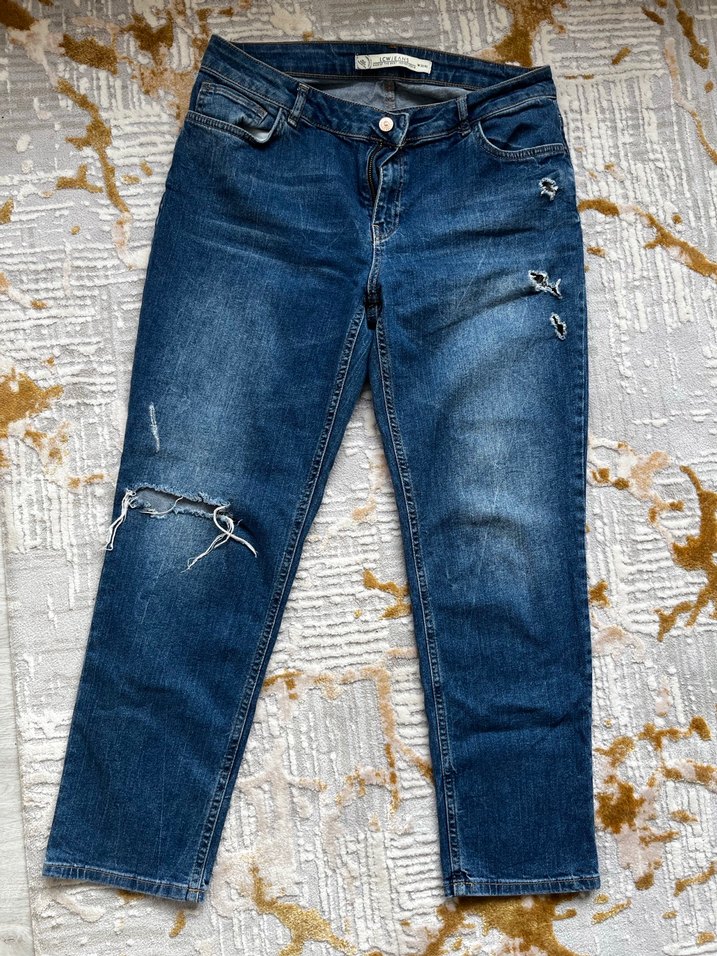 Bol kesim, mavi midi denim kot pantolon, tokalı detay ve hafif yırtıklarla günlük rahat kullanım için uygundur.