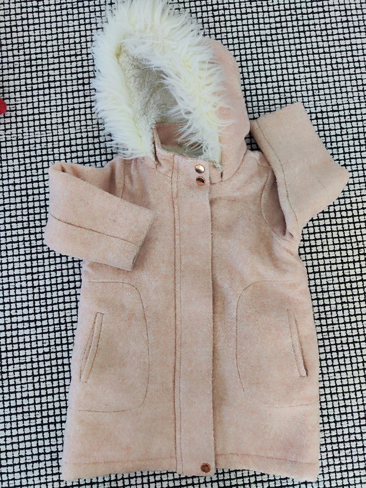 pudra renk. fotoğraflarda göründüğü gibidir, kullanıma engel hiçbir kusuru yoktur,bir kış kullanıldı. çok şık ve sıcak tutan güzel bir palto.