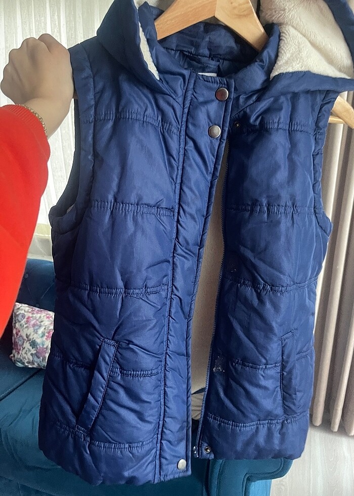 Yelek mont lacivert. 14-15 yaş. Çok çok iyi durumda içi peluş, şapkalı.
