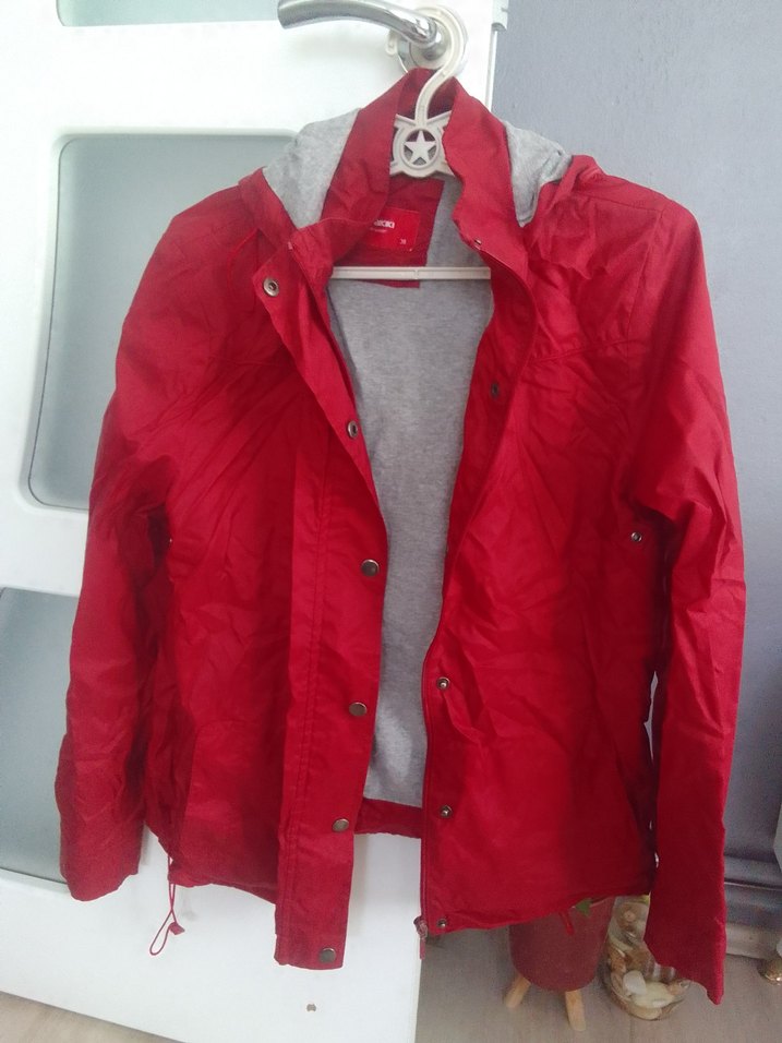 Düğmeli önden kapamalı, kırmızı ve gri astarlı, uzun kollu, normal boy midi kadın ceket. Rahat ve şık sokak stili için uygundur.