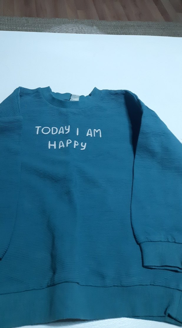 Mavi renkli, uzun kollu ve bisiklet yaka triko sweatshirt. Ön kısmında renkli "TODAY I AM HAPPY" baskısı bulunan rahat kesim.