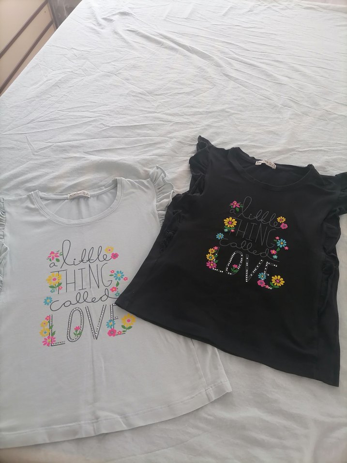 Kız çocuk siyah tişört, kısa kollu ve fırfırlı detaylıdır. Bol kesim, yuvarlak yaka ve renkli "a little thing called LOVE" baskısı ile bohem tarzda.