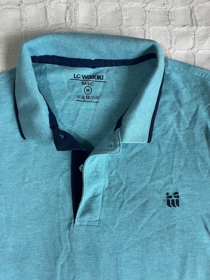 Mavi pastel renkte, kısa kollu, düğmeli yakalı ve vücuda oturan erkek polo tişörtü. Sentetik yumuşak kumaştan, normal boyda, açık hava kullanımı için uygundur.
