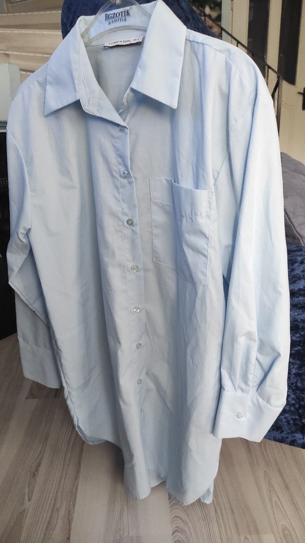 LCW mavi pamuklu tunik gömlek, yakalı ve düğmeli ön kısmı ile uzun kolludur. Bol kesim ve midi boydadır, gündelik kullanım için uygundur. Hiç kullanılmamıştır. XS ve S bedene uygundur. Geniş kalıp olduğu için M bedene de uyabilir. Fotoğraflarda net olmadığından dolayı renk gri gibi görünmektedir ama açık mavi renktir. Gömleğin etek kısmında yandan minik yırtmaçları vardır. Ölçüleri; boyu 84,5 cm fakat ön tarafı 5 cm daha kısadır. Kol uzunluğu 52 cm, bel genişliği 52,5 cm'dir.
