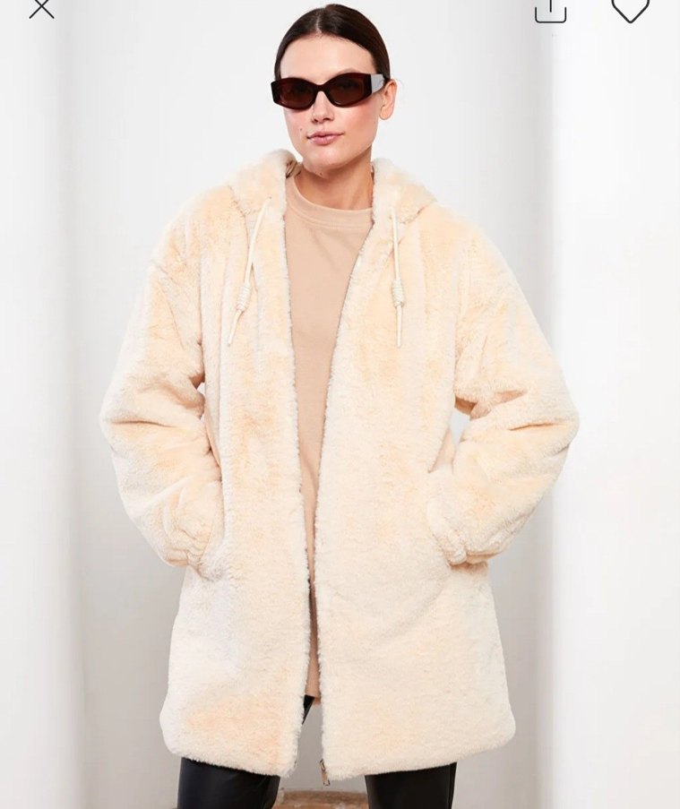 Bej renkte, midi boy ve bol kesim kadın peluş mont. Uzun kollu, yakası kesik detaylı ve yumuşak fleece kumaştan üretilmiştir. Günlük kullanıma uygundur.