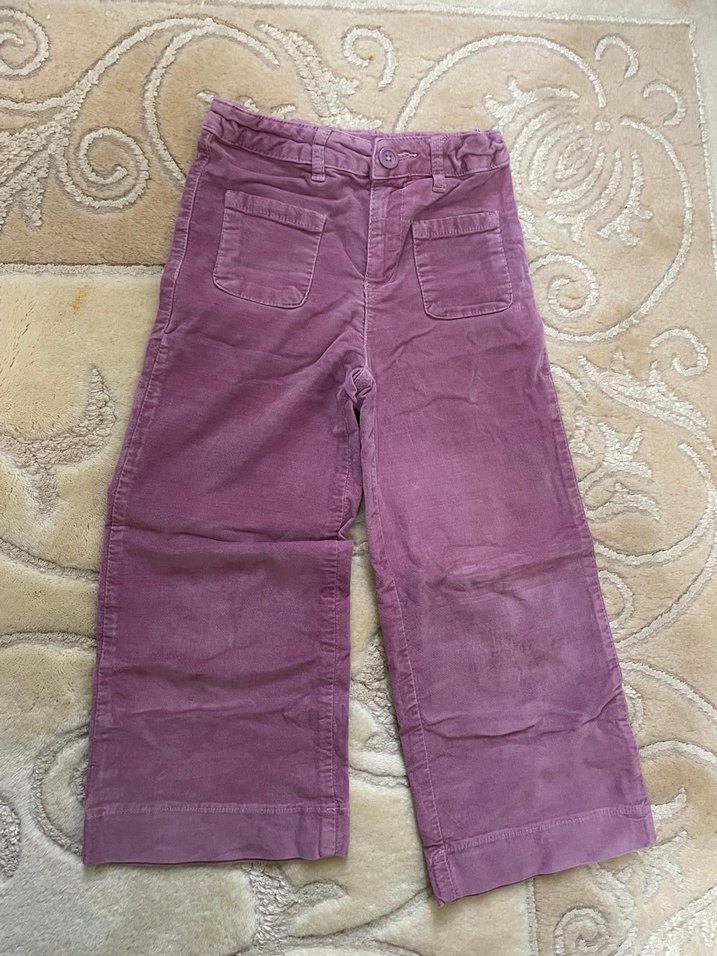 Mor süet kumaştan, düğmeli ve cep detaylı bol kesim kız pantolonu. Rahat ve gündelik tarz için uygundur.