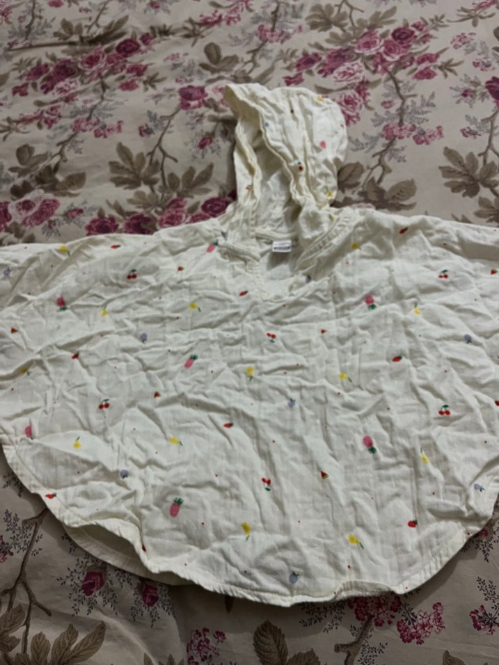 Kız çocukları için kapüşonlu, kolsuz ve bol kesim panço. Yumuşak sentetik kumaştan, pastel nakışlı ve fırfırlı, bohem tarzda.