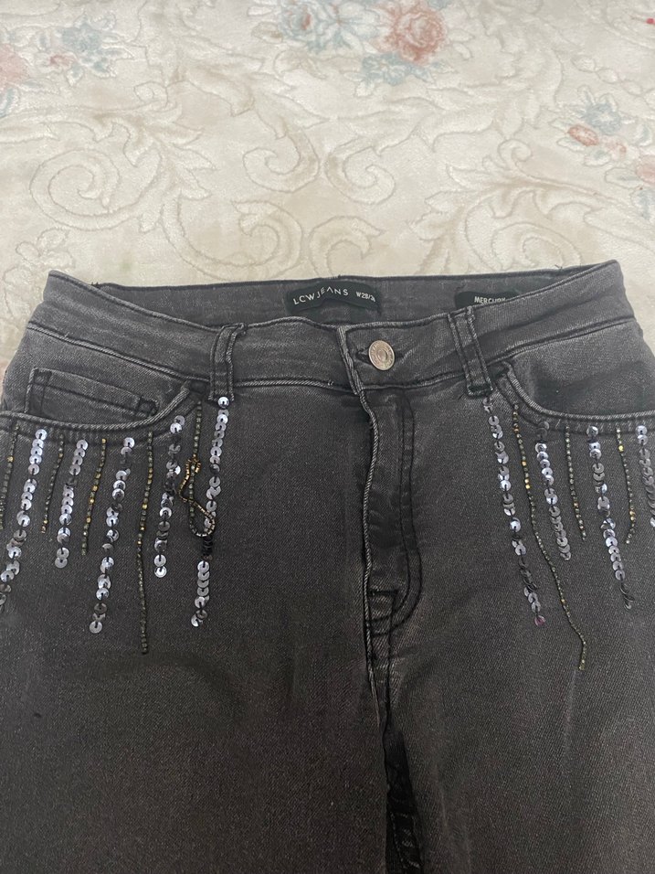Sorunsuz tertemiz. Rengi koyu gridir. Çok az kullanıldı. Önde payetli nakış detayları var, dar kesim kadın jean.