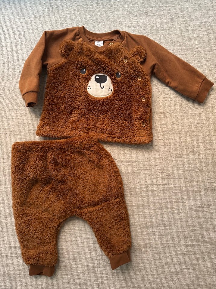 Kahverengi, yumuşak ve sıcak kumaştan yapılmış, uzun kollu ve bisiklet yakalı erkek bebek takımı. Üstünde sevimli peluş ayı yüzü detayları bulunur. Hiç giydiremedim bebeğime denk gelmedi çok severek almıştım. Sadece 1 kez yıkandı. Sıfır ayarında.