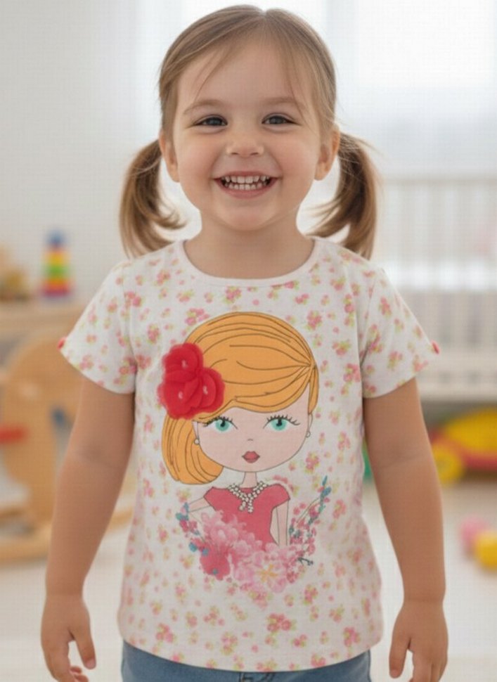 Lcw marka kız çocuk için pembe renklerde baskılı T-shirt.. kısa kollu, bisiklet yakalıdır. Yumuşak pamuktan üretilmiş, pastel tonlarda çiçek baskısı ve karakter resmi bulunur. 2-3 yaş için uygundur.En 30 cm Boy 38 cm