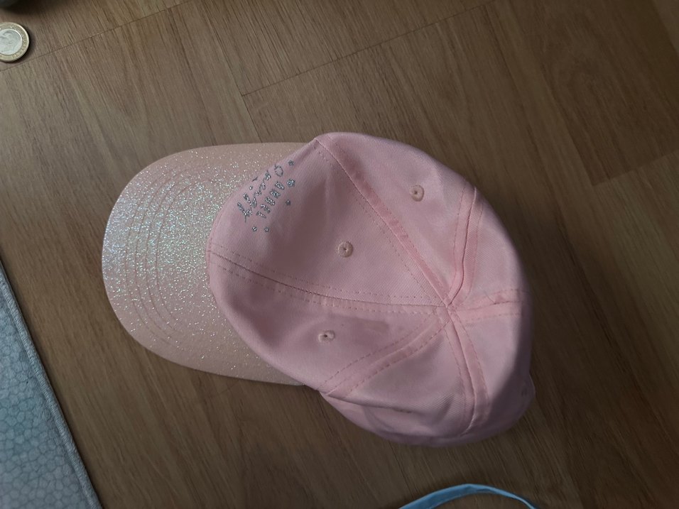 Düğmeli ve işlemeli detaylara sahip pastel pembe çocuk şapkası, rahat sentetik kumaştan üretilmiştir.