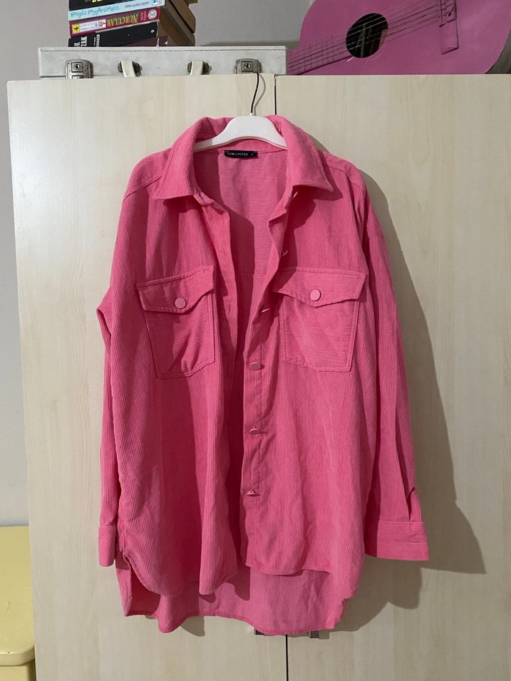 Pembe keten kumaştan, düğmeli, uzun kollu, cepli ve salaş kesim kadın gömlek. LCW marka L beden sorunsuz tertemiz