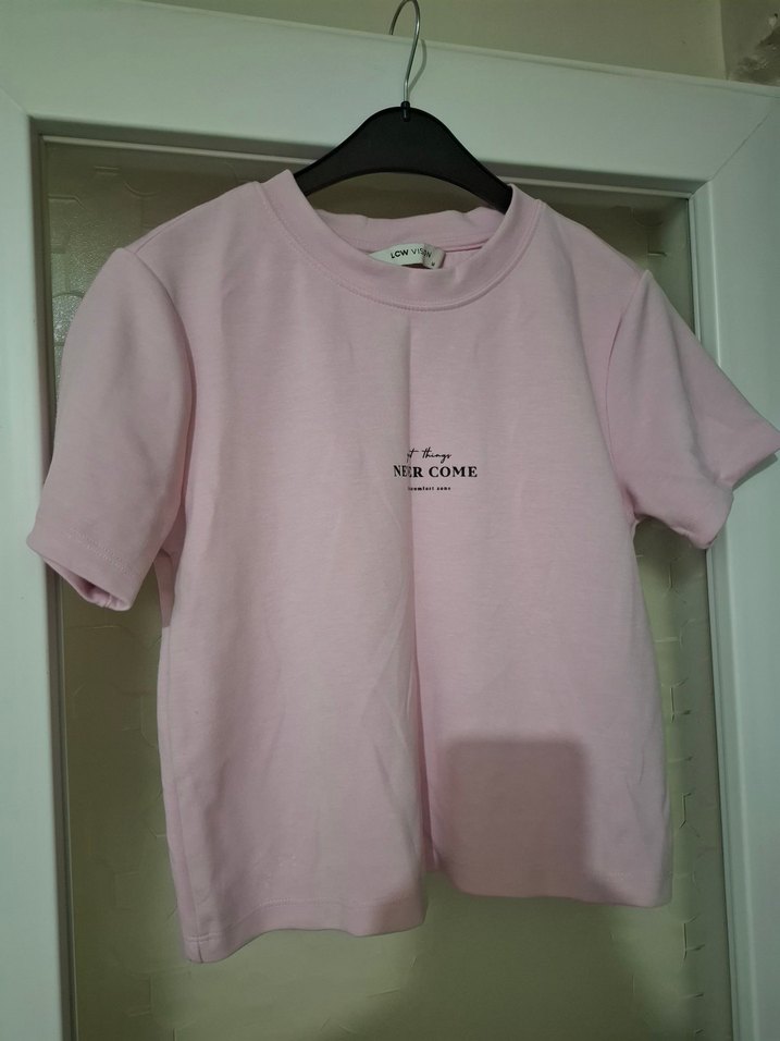 Pastel pembe pamuk tişört, kısa kollu, yuvarlak yaka. Günlük kullanıma uygun. Sıfır üründür