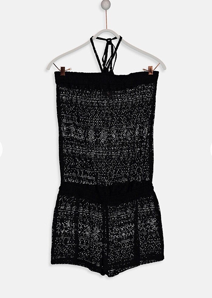Sıfır ayarında. Boyundan bağlamalı straplez yaka tulum şort. Boy 64 cm. Yüzde 100 polyester.