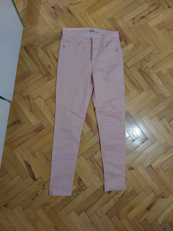 Yumuşak sentetik kumaştan yapılmış, düz renk pembe pantolon. Günlük kullanım için rahat ve şık bir seçimdir.