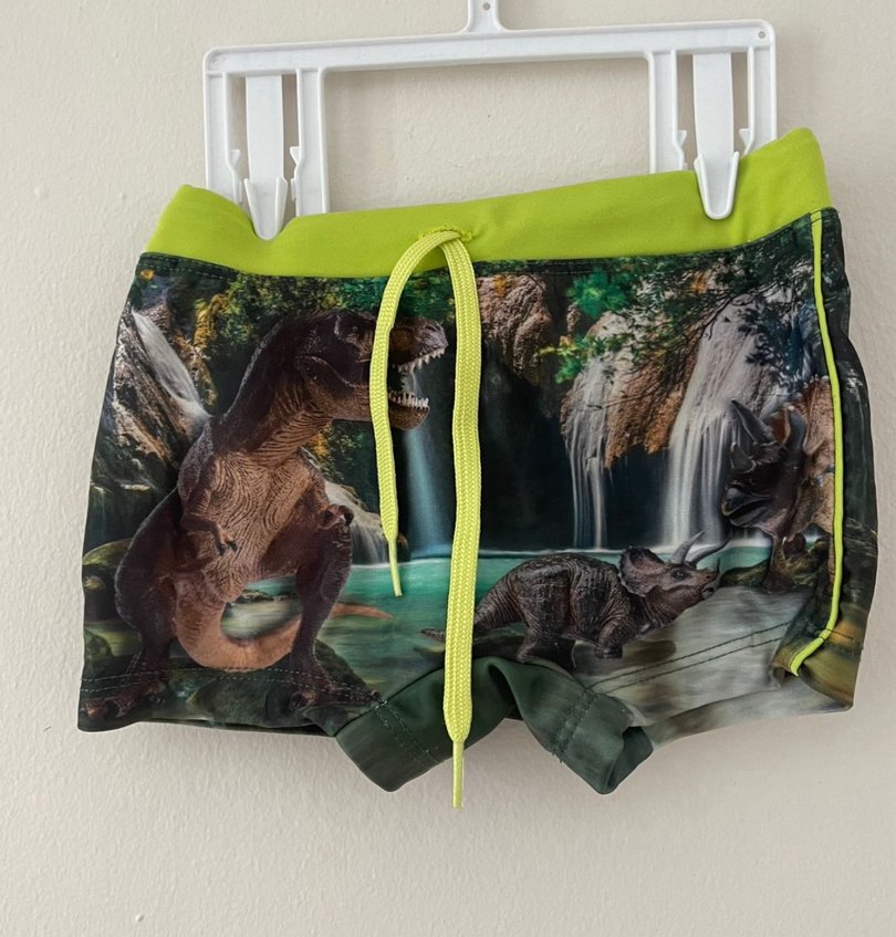 LCW yeşil bel bantlı ve sarı bağcıklı, dinozor baskılı renkli erkek çocuk mayo. Defosuz. 3-4 yaş.
