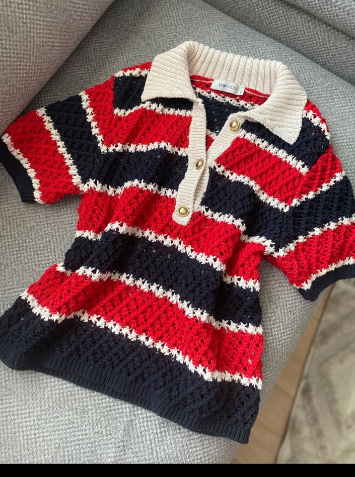 Örgü kumaştan, bol kesim ve kısa kollu, yakalı bohem tarzda çok renkli çizgili kadın kazak. Midi boyda, rahat ve şık.