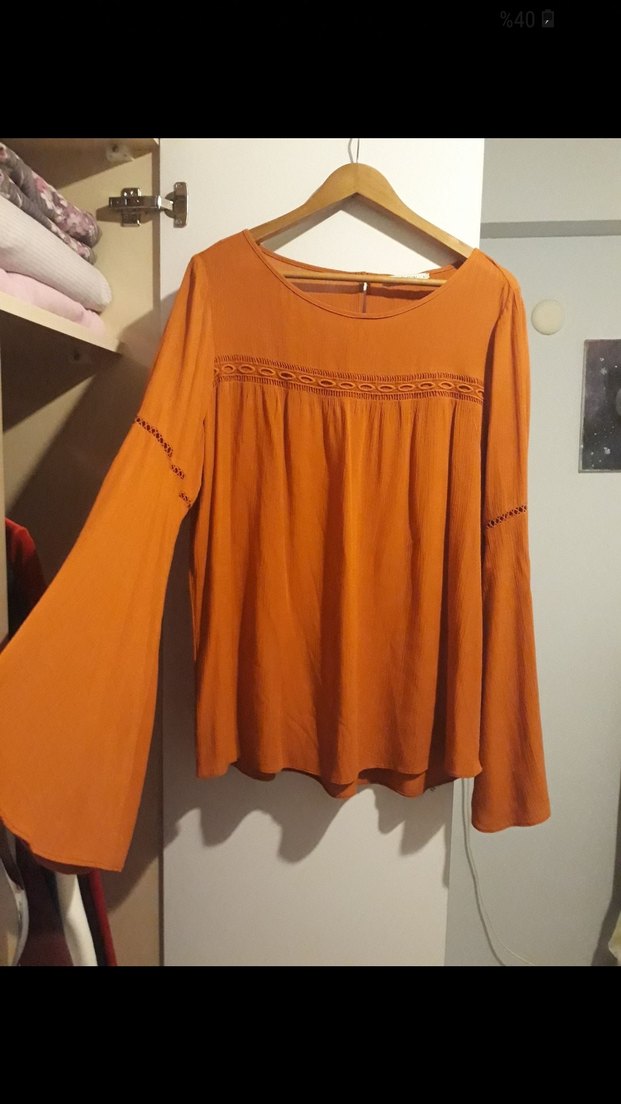 Yumuşak keten kumaştan, uzun kollu ve salaş kesimli, yuvarlak yakalı kiremit renkli kadın bluzu. Günlük kullanım için uygun. yaka ve kolları işlemelidir.