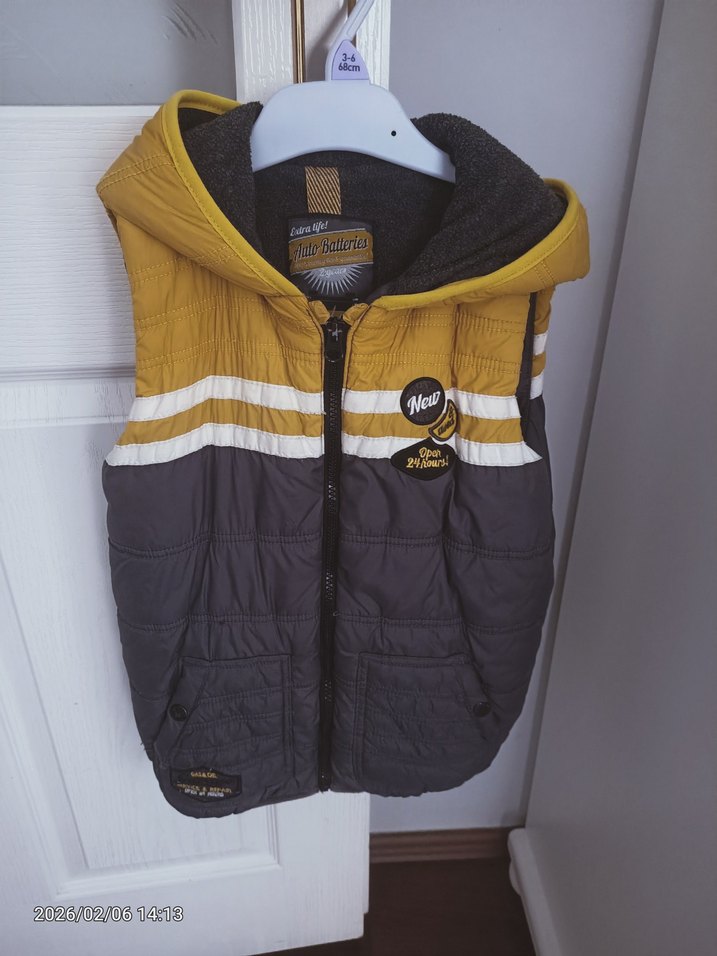 Temiz giyildi. İçi polar. Sarı ve gri renklerde, fermuarlı, kapüşonlu, baskılı ve fitted kesim erkek çocuk yeleği. Yumuşak ve sıcak kumaştan üretilmiştir.