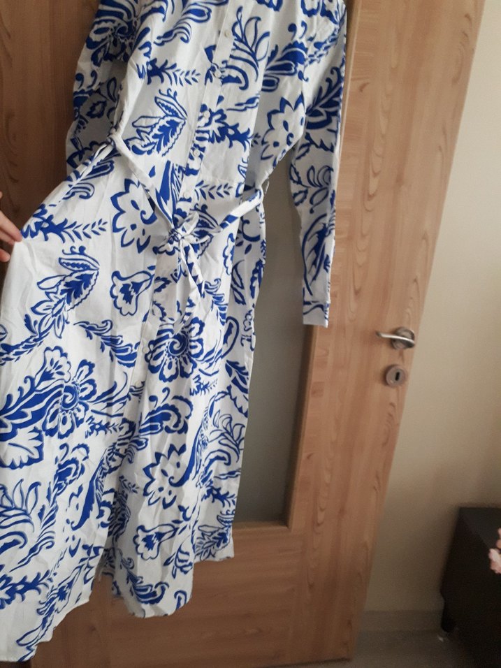 V yaka ve uzun kollu, mavi desenli, dökümlü, bol kesim uzun elbise. Yumuşak sentetik kumaştan bohem tarzı için uygundur.