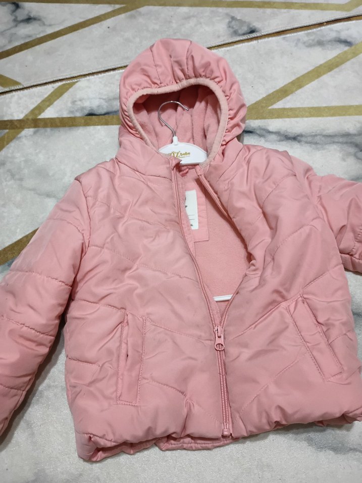 Kız çocukları için pembe, kapüşonlu ve polar detaylı, yumuşak ve sıcak kumaştan yapılmış, fit kesim mont. az kullanıldı