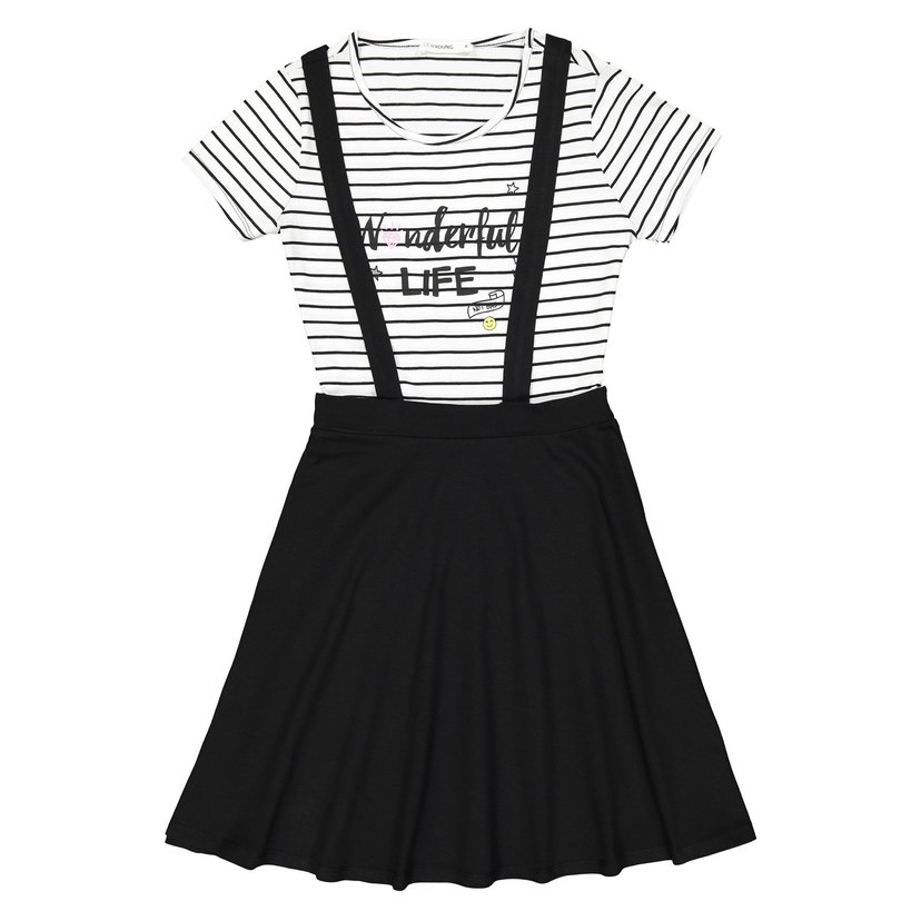 siyah kemerli askılı etek ve beyaz çizgili, yuvarlak yakalı üstten oluşan, bol kesim likralı kumaştan elbise. Ev giyimi için kullandım 5defa giymişimdir en çok