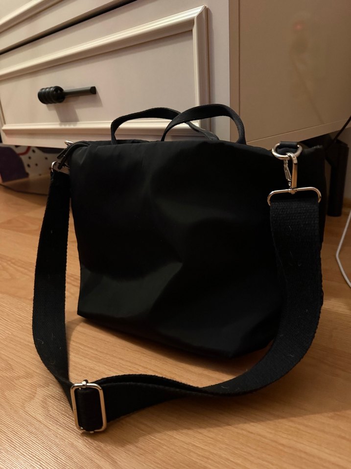 Siyah deri tokalı, minimalist gotik tarzda kadın çantası. Desensiz, ayarlanabilir askılı, günlük kullanıma uygun.