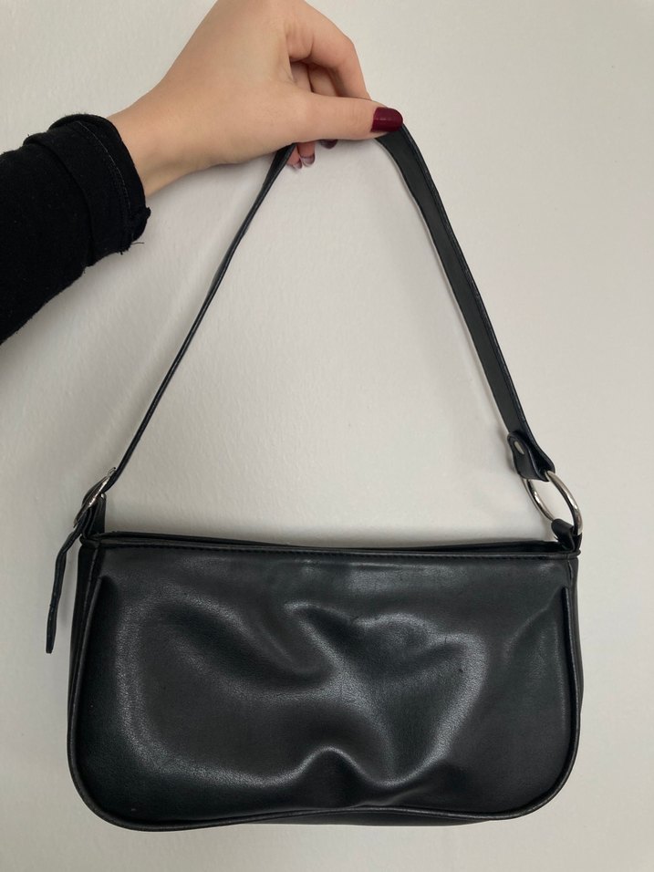 Günlük kullanıma uygun, tokalı askılı, siyah deri, desen içermeyen minimalist kadın çantası.