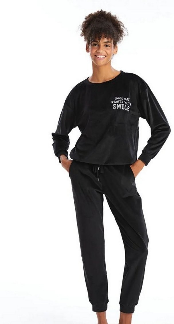 Kadınlar için siyah batik desenli, bol kesim uzun kollu pijama takımı. Üstte "Good day starts with SMILE" yazısı bulunur, rahat ve şık bir tasarım sunar. Lcwaikiki marka etiketli sıfır üründür m beden
