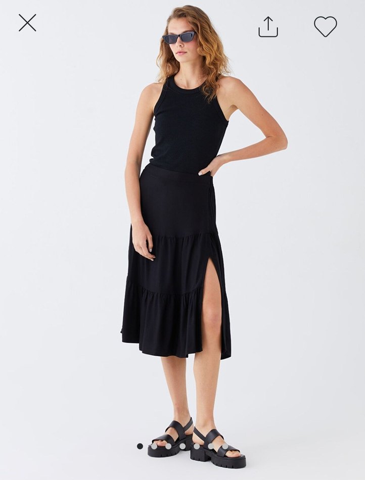 Siyah, salaş kesim midi etek, yan yırtmaçlı ve yumuşak pamuklu kumaştan. Kusuru yoktur.